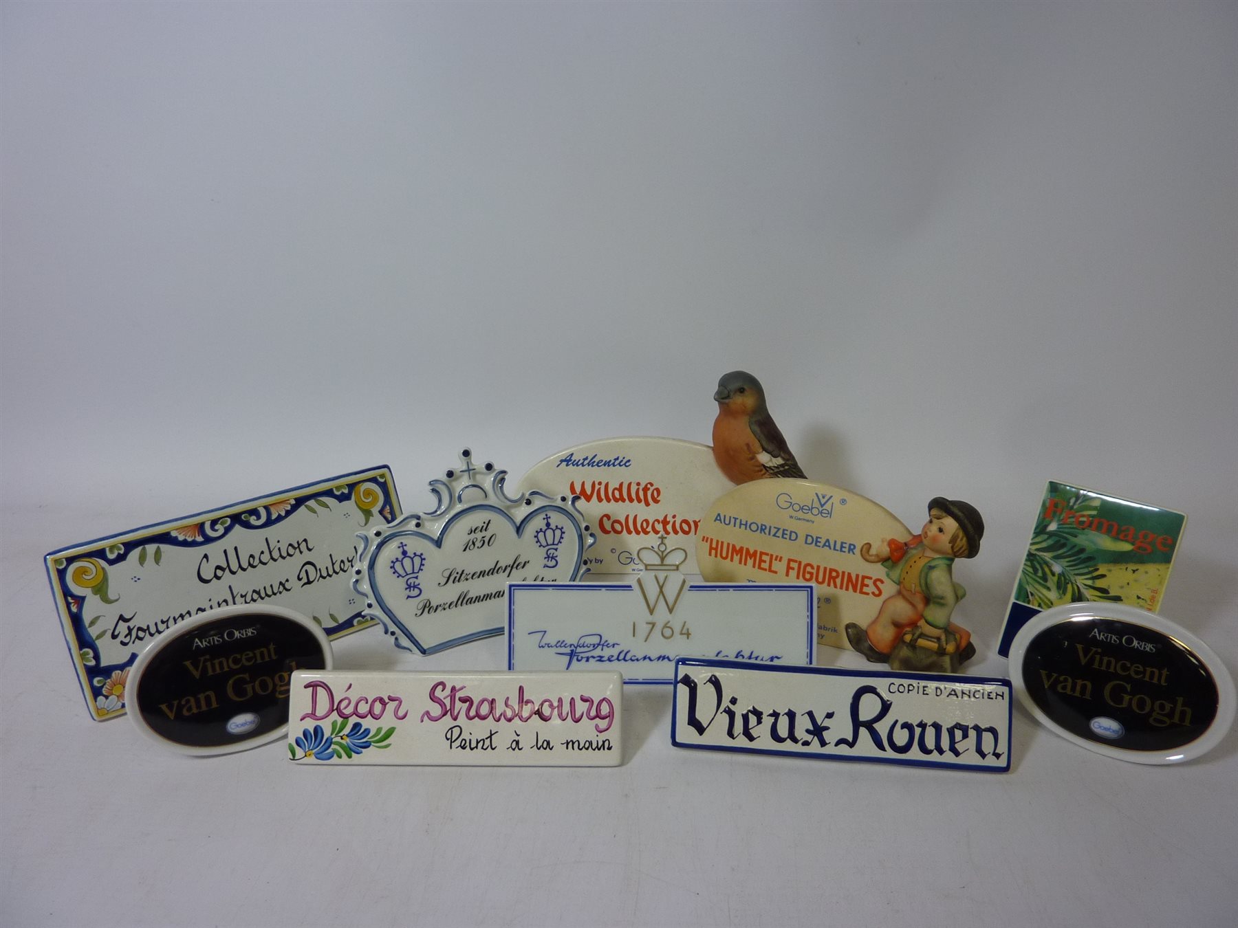 Ten ceramic advertising plaques - Goebel 'Wildlife Collection' and 'Hummel' Sitzendorf and seven others