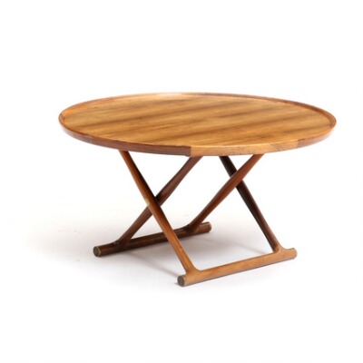Circular Brazilian rosewood coffee table mounted on foldable frame