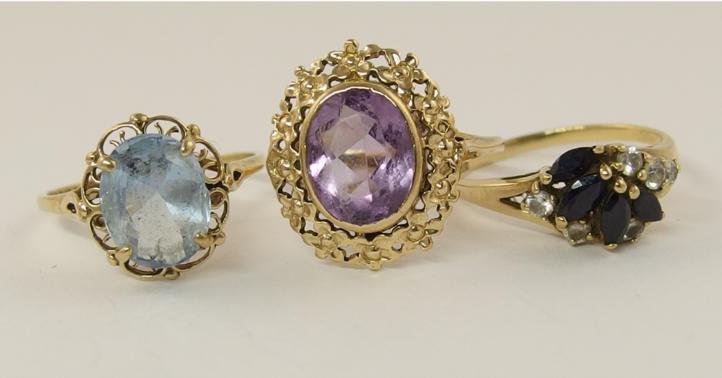 Three 9ct gem set rings to include amethyst, sapphire etc