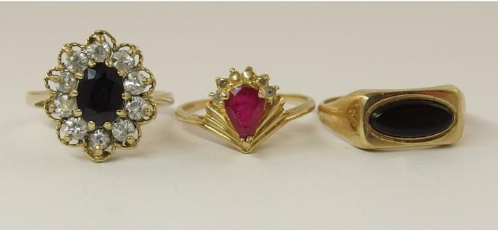 Three 9ct gem set rings to include ruby and diamond, onyx and sapphire