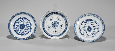 Three antique Chinese blue and white porcelains; two showing floral designs; together with other centering bat and Shou motifs; 18th Century; D: 7 5/8" (widest, approx.)