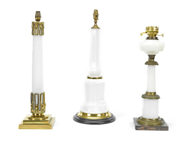 comprising one of column form with pierced mounts on stepped square base, another of canted baluster form and another of column form with reservoir and circular base on marble plinth together with spiral moulded shade, all fitted for electricity