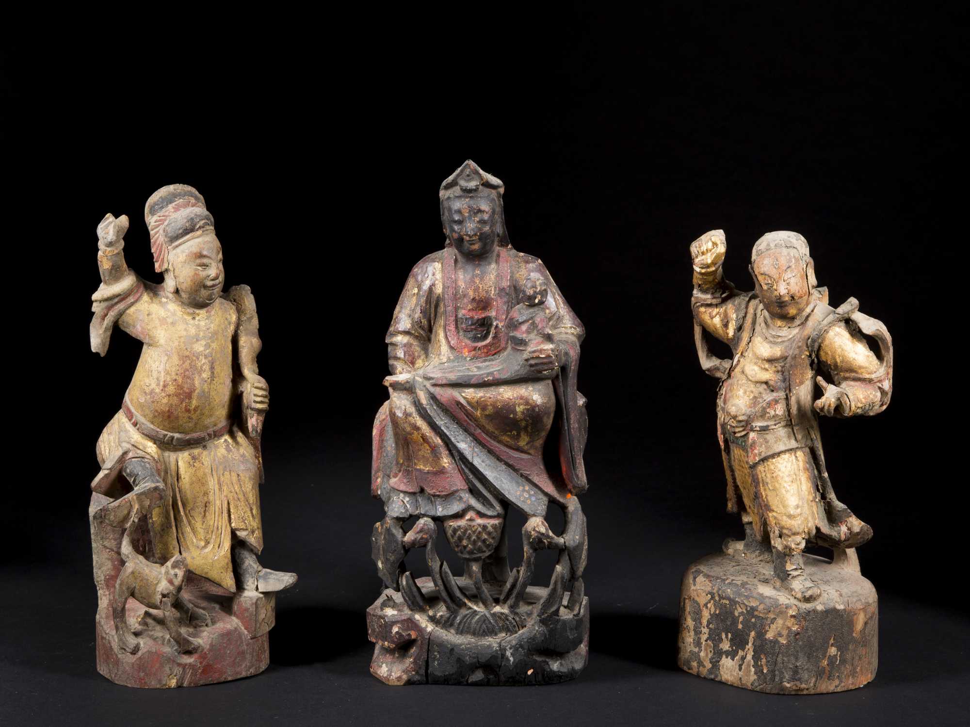 each approximately 11" tall, two appear to be warriors the other Buddha holding a child, some surface losses, all appear to 19thC or earlier