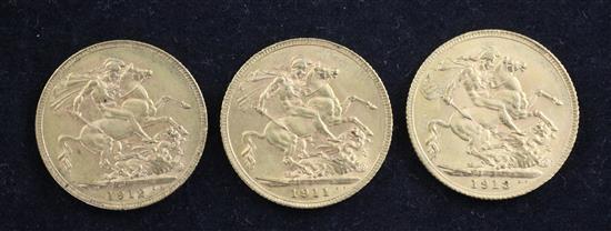 Three George V gold sovereigns, 1911, 1912 Perth Mint and 1913, all near EF