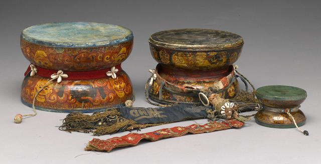 The largest with painted sides of alternating dried skulls and freshly severed heads; the smaller with scenes of charnel grounds and decomposing heads; the smallest with foliate scrolls and blossoms