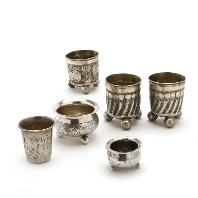 Two Russian silver salt cellars and Russian silver vodka cup. From 18th century until 1908. Various sizes (6).
