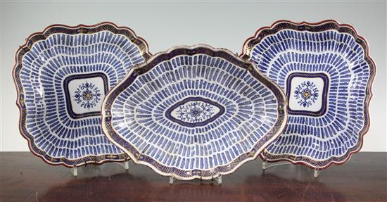 Three Worcester 'The Music Pattern' dessert dishes, Flight period, one with crescent mark