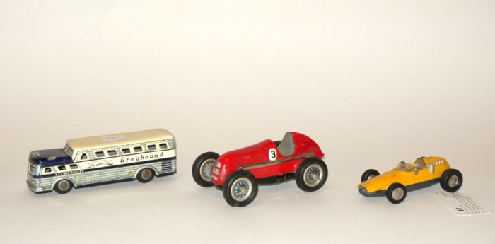 Micro Racer Ferrari No. 1040/1 and Studio 1050, mechanical, Schuco, Length 11 and 14 cm, and greyhound bus, lithographed sheet. Some parts are missing.