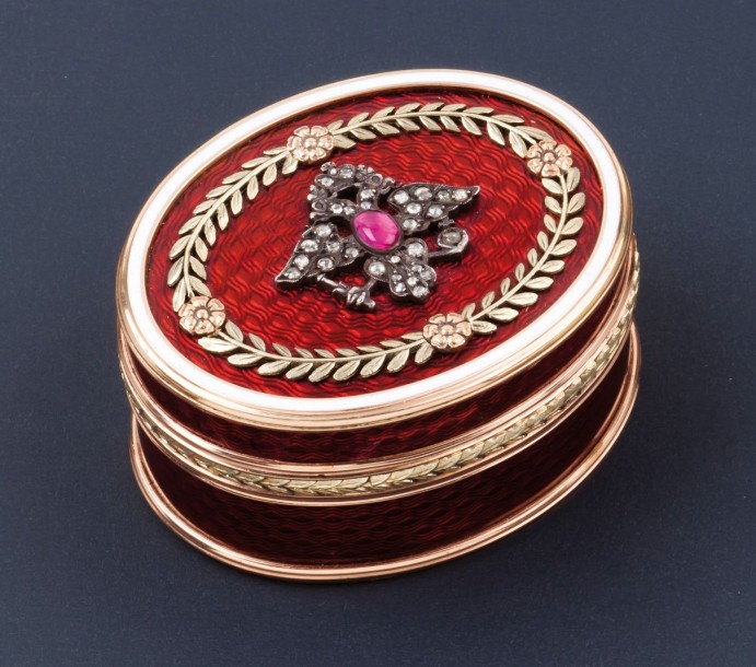Transmission 14K Yellow Gold Enamel red, decorated with rose-cut diamonds and a red stone cabochon