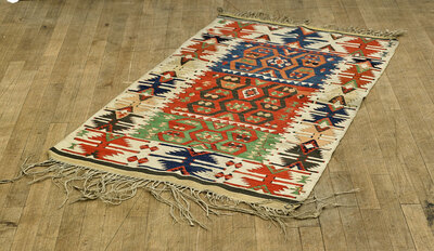 Turkish woven wool carpet; centering a green, red and blue panel of geometric designs on a tan ground; Provenance: Collection of Gabriella "Kay" Robertson of Loewi-Robertson Inc.; 51" x 32" (approx.)