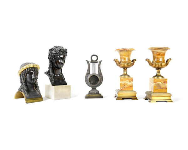together with a pair of late 19th century gilt bronze and Sienna marble garniture urns and a patinated bronze watch stand in the form of a lyre the busts probably originally furniture mounts the first bust on a square marble base, the second on an ar