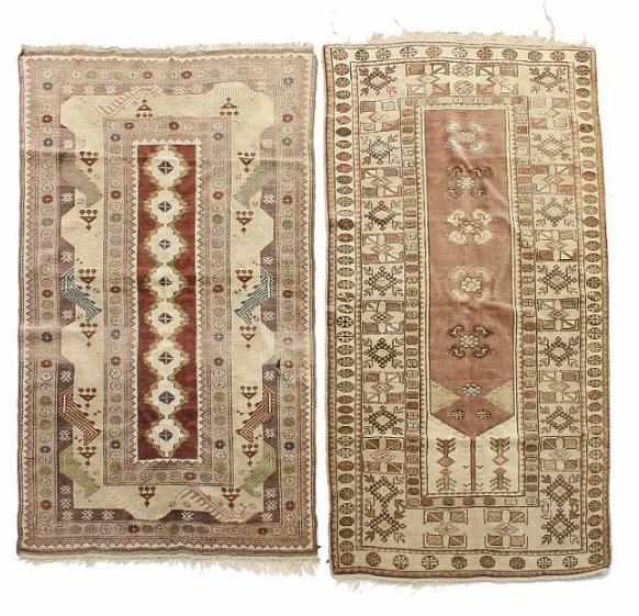 Two Anatolian Melas rugs, embellished with ornamentation on light brown base
