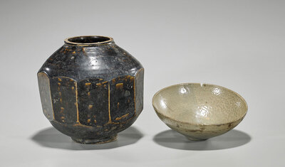 Two antique Korean ceramics: Joseon Dynasty faceted globular jar, featuring a dark brown glaze; together with Goryeo Dynasty bowl, showing a celadon glaze; H: 8" (tallest, approx.)