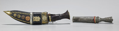 Two Asian daggers: Chinese, exhibiting incised floral designs to scabbard and handle; together with Nepalese kukri, the blade inscribed 4040 / GORKHA ARMY, enclosed scabbard, comprising two small knives, and decorated with metalwork implements; L: 14