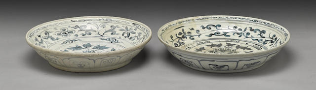 Each with the interior well painted in underglaze blue with a stylized floral roundel encircled by leafy blossoms or tendrils below a scroll band at the rim, the exterior ringed with jeweled lappets and the base applied with brown iron oxide (each wi