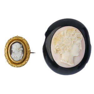 The first designed as a profile of a lady, possibly Mary Queen of Scots, to the cannetille surround, together with a jet brooch, the shell cameo mounted to the centre and depicting a lady in profile. Lengths 2.3 to 4.3cms. Weight 19.7gms.