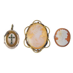 The locket of oval outline, with a seed pearl and green gem-set cross to the front and an engraved ivy leaf cartouche to the reverse, together with a cameo brooch, the shell carving depicting a bacchante. Lengths 3.2 to 5.7cms. Weight 36gms.