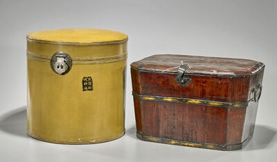 Two Chinese covered boxes: antique wood, of polygonal form, with metal fittings, 19th Century; together with round, showing six-character mark to side; L: 18" (longest, approx.)