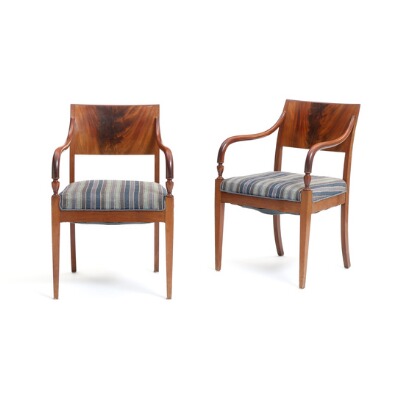 Two circa 1900 empire style mahogany armchairs, decorated with vases at the edge of the armrests.