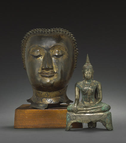 The larger face, Lan Na style, Ayutthaya period, circa 16th century, with high-arched brows converging into the thin bridge of his nose; the smaller silvered bronze, Ayutthaya syle, 20th century (minor losses to back).