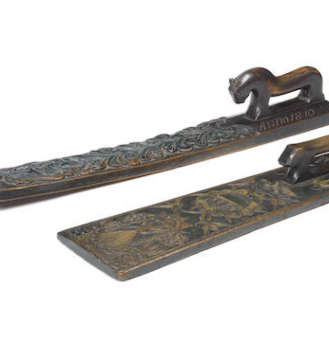 Two early 19th century Scandinavian carved oak polychrome mangle boards