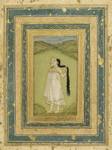 Each opaque watercolor on paper; the first Provincial Mughal, late 17th/18th century of a partially clad beauty wringing water from her long tresses in a landscape of rolling hills and set within multiple border bands; the second Kotah, circa 1830-18
