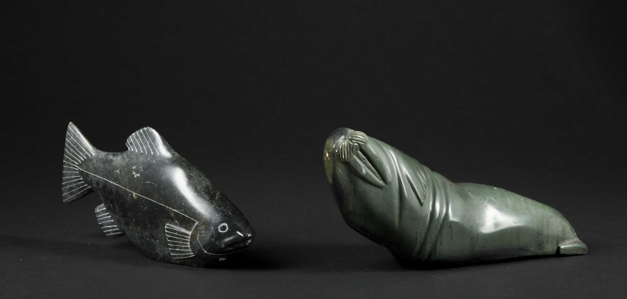 halibut fish signed on the bottom edge Joe Aceliak & numbered, 10 1/2" long walrus signed GWR 40880 and tagged on the bottom