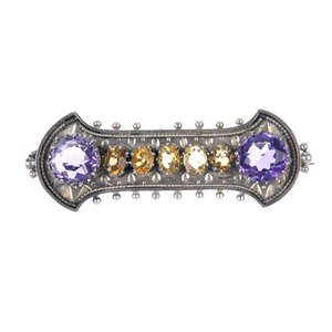 To include an amethyst and citrine bar brooch with outer bead detail and a carved amethyst pendant. Lengths 4.9 and 5.9cms.