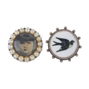To include a 9ct gold split pearl photograph pendant, and a pietra dura bird lapel pin. Pendant may be worn as a brooch. Diameters 2.9 and 2.4cms. Weight of 9ct gold item 5.9gms.