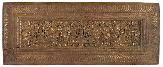 The larger carved with Avalokitshvara Shadakshari, Manjushri, and Vairochana seated on elaborate thrones amid flora and fauna; a kirtimukha on the right edge and buddhas with inscriptions painted in red, black, and gold on the reverse; the smaller wi
