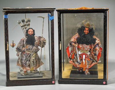 Two large and elaborate Japanese samurai dolls; one holding bow and arrow; the other holding sword; Provenance: Collection of Yoshiko Faye Osako-Nakamura; H: 24 1/2" (each, approx.); in wood and glass display cases