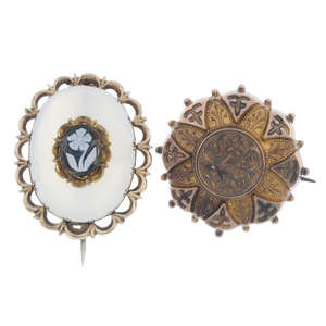 The first of oval-outline with scalloped surround to the white chalcedony and a central onyx flower cameo, the second of circular outline with acanthus engraving. Lengths 2.8 to 3.3cms. Weight 12.8gms