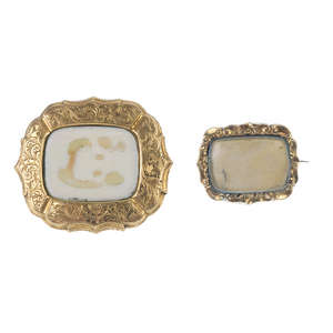 To include an ivory scrolling brooch, together with a woven hair scrolling brooch. One AF. Lengths 4.2 and 2.7cms. Total weight 17gms.