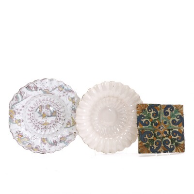 respectively undecorated and with figures in colours, and four tiles. 18th century. Diam 34 cm. (3)