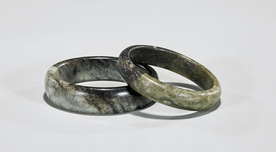 Two Chinese Ming Dynasty jade bangles: one of celadon and deep green-black coloration, carved in light relief with various animals, including a horse and a dog; the other of pale celadon with dark brown-black suffusions; D: 3 1/2" (larger, exterior)