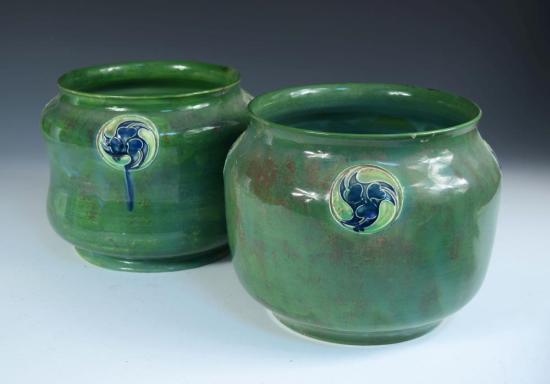 Two Moorcroft Flamminian ware jardinieres for Liberty & Co., each of rounded ovoid form, with tubelined foliate roundels, and allover green glaze, printed and impressed marks (2) h:19 w:23 cm