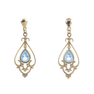 Two pairs of earrings. To include a pair of twisted ear hoops, and a pair of 9ct gold blue topaz ear pendants. One pair with hallmarks for Birmingham. Lengths 2 and 3.2cms. Total weight 4.3gms.