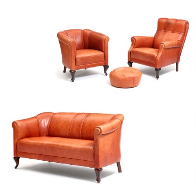 Living room suite comprising two-seated sofa, high- and low backed easy chair and marocco pillow, recently upholstered with cognac coloured leather, stained beech legs. L. 162 cm. (4)