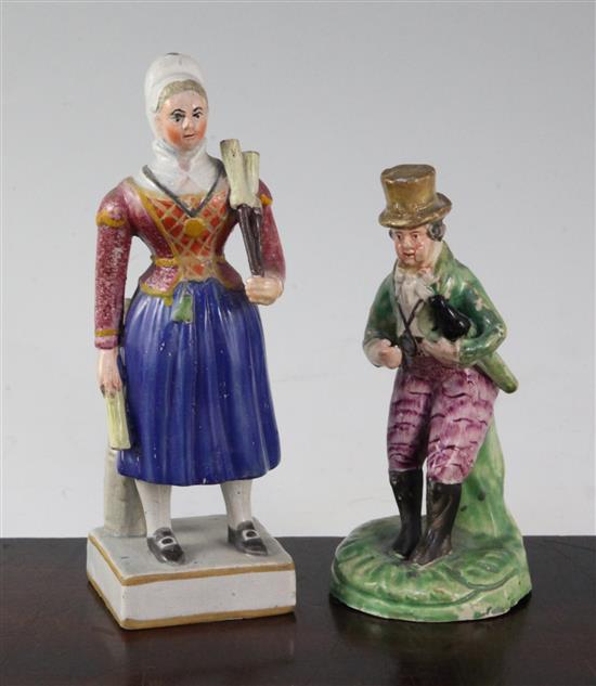 Two Staffordshire pottery theatrical figures, early 19th century, comprising a pearlware figure of Madame Vestris as the Broom Girl and John Liston as Paul Pry, 16cm & 12.5cm