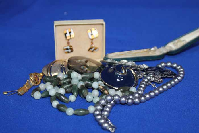 TWO STICK PINS each with single pearl and a small group of bijouterie including a jade bead necklace, brooches and cufflinks
