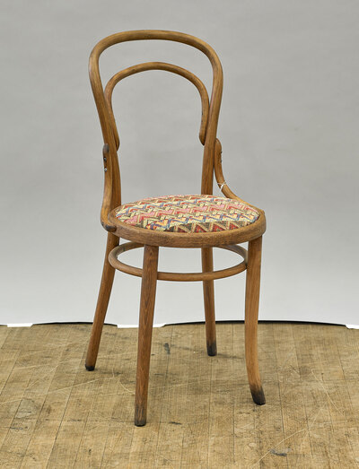 Carved wood chair by D. Matthews & Son Ltd; the round form, surmounted by upholstery, showing colorful geometric designs; resting atop four curved legs; Provenance: Collection of Yoshiko Faye Osako-Nakamura; 34" x 16 1/2" x 14 1/2" (approx.)