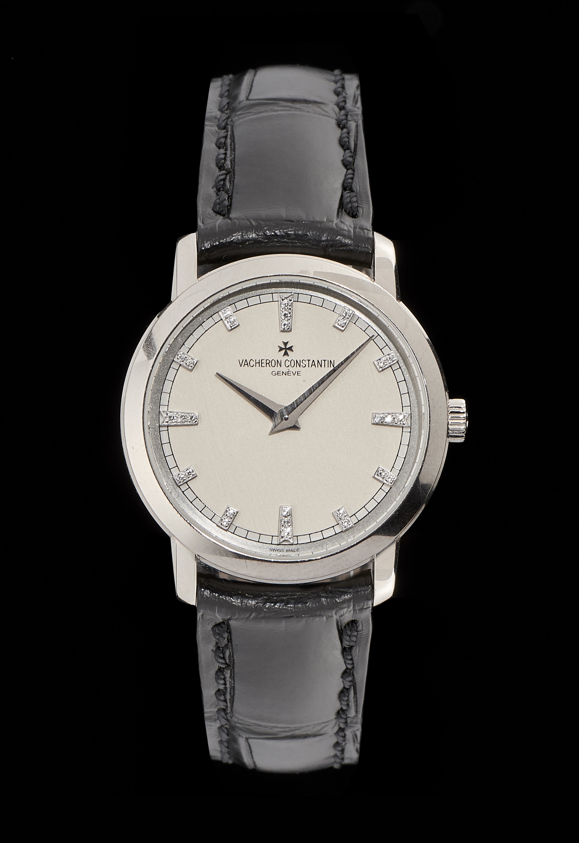 Cadran crème, aiguilles argentées, index bâtons sertis de diamants, or gris 750, D 30 mm, poids brut 36 g