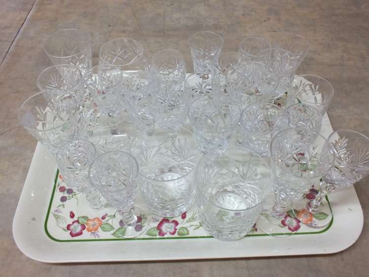 Various cut glass wines, tumblers and brandy glasses (three trays)