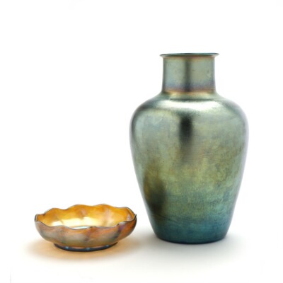 Vase and bowl of iridescent “favrile” glass