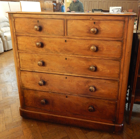 with moulded edge top, two short and four long graduated drawers, with wooden handles, on plinth base