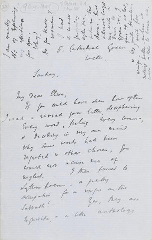 Autograph Letter, 4 pp recto and verso, 8vo (conjoined leaves), Wells, Sunday, [August 9, 1908], to CLIVE BELL, on blue paper.