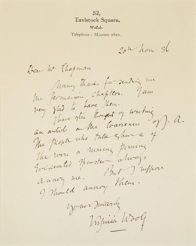 Autograph Letter Signed ("Virginia Woolf"), 1 p, 4to, London, November 20, 1936, to R.W. CHAPMAN, on personal stationery, a little toned at edges.