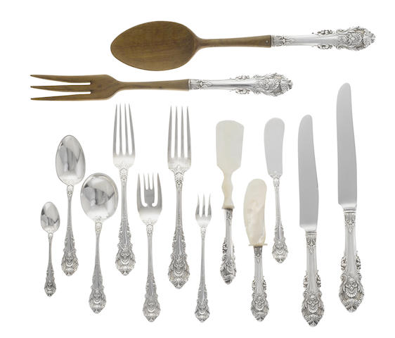 'Sir Christopher', comprising: 11 dinner forks, 12 dinner knives, 11 luncheon forks, 12 luncheon knives, 12 salad/dessert forks, 12 butter spreaders, 12 round bowl soup spoons, 11 cocktail forks, 12 caviar knives, 20 teaspoons, 12 demitasse spoons an