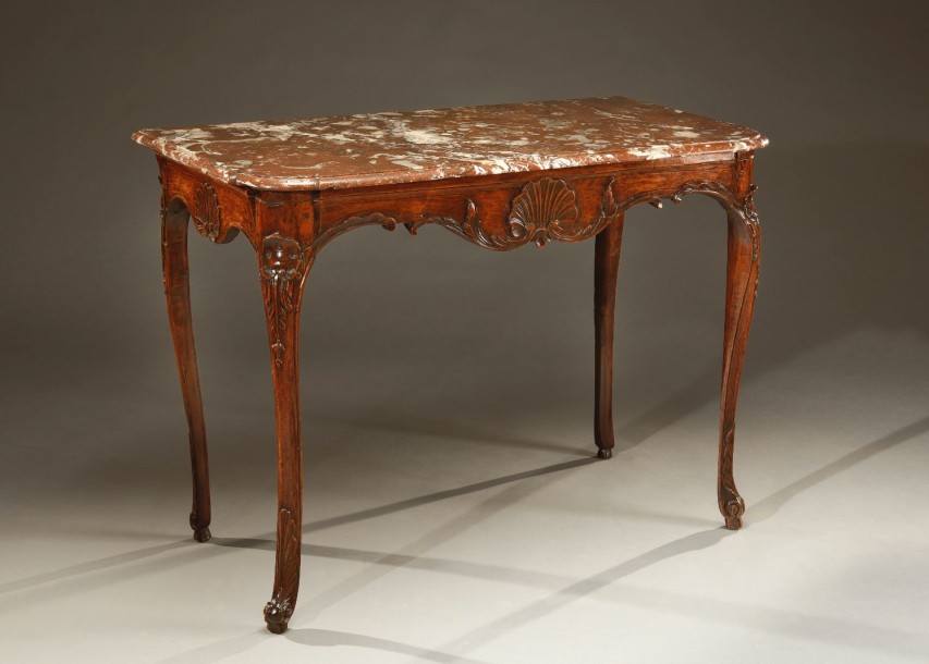Walnut game table carved with shells and foliage, fretwork, resting on four arched feet.