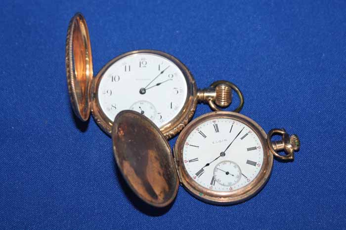 the case engraved with a floral pattern, along with an Elgin plated pocket watch